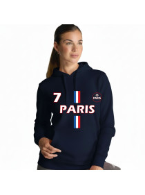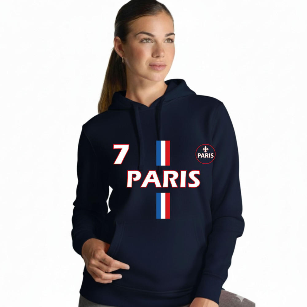 Ce modèle bleu marine présente un motif graphique fort, centré sur le nom "PARIS", le numéro 7, et des bandes tricolores verticales. Un écusson circulaire stylisé avec une fleur de lys symbolise l'esprit parisien. Idéal pour un look sportif et urbain.