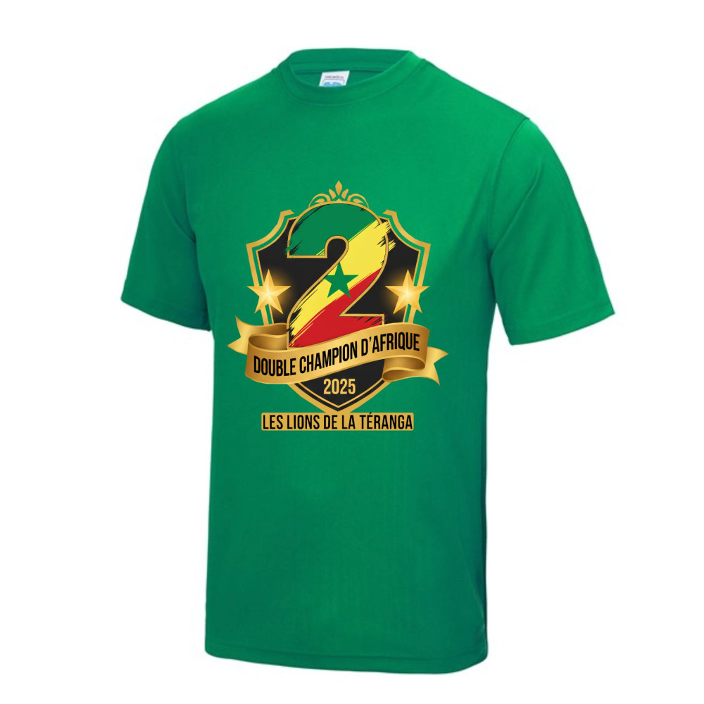 Célébrez l'histoire avec ce tee-shirt commémoratif "Double Champion d'Afrique 2025". Arborant le vert emblématique du Sénégal, ce modèle met en avant un blason doré prestigieux et le chiffre 2 aux couleurs nationales. Un incontournable pour immortaliser la domination des Lions de la Téranga sur le continent.